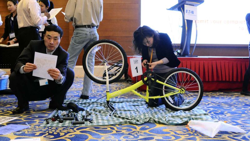 Teams solve fun and active problem solving challenges and puzzles to “earn” tools and bicycle parts for their team. When teams have enough resources, they begin the challenging task of creating an efficient assembly process to produce a variety of different bicycles in a limited time. Strict quality standards are imposed with formal quality control inspections conducted.